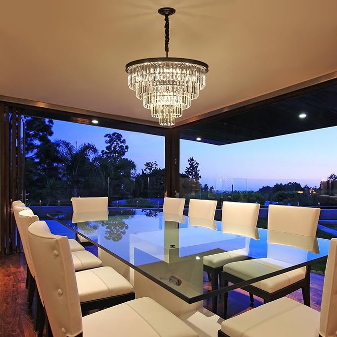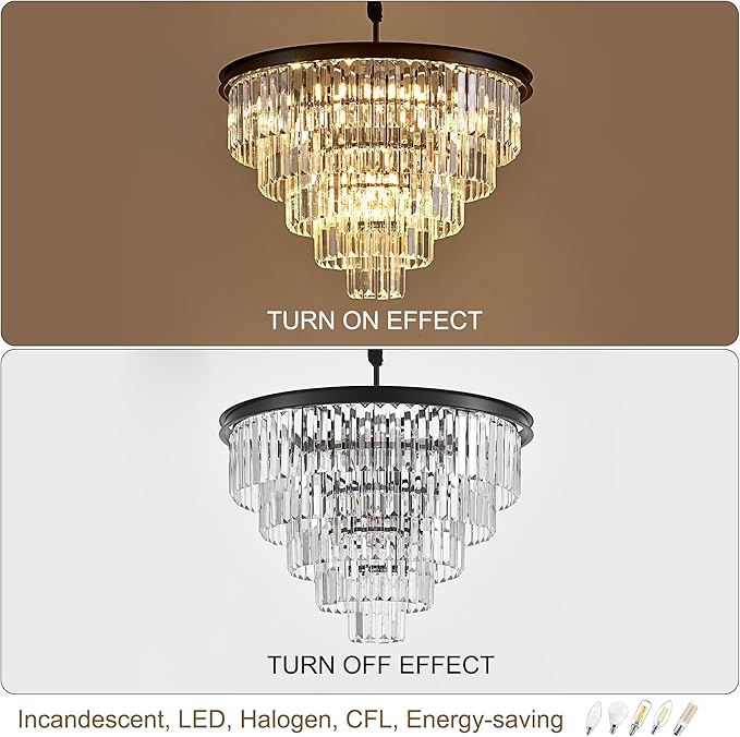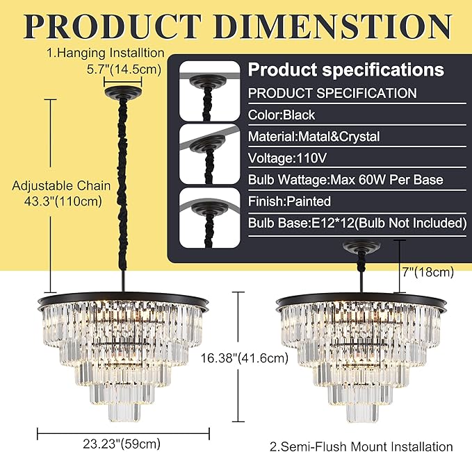 • 【12-Light Crystal Chandelier】: This Crystal chandelier built in clear crystals, superior metal iron with matte black painted, and combines classic and contemporary elements with eye-catching results, enhancing the luxury&sparkling effect.we also adopt constructed using high quality materials to ensure product is built to last.