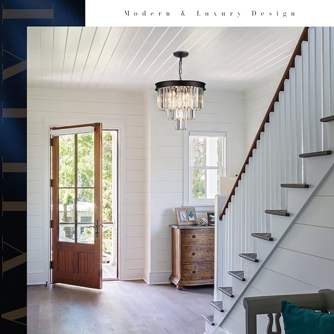 AXILIXI Modern Crystal Chandeliers 16” Black Ceiling Pendant Light Fixture 3 Tiers Dimmable Flush Mount Chandeliers Round Raindrop for Living Room Dining Room Foyer Kitchen Entryway
