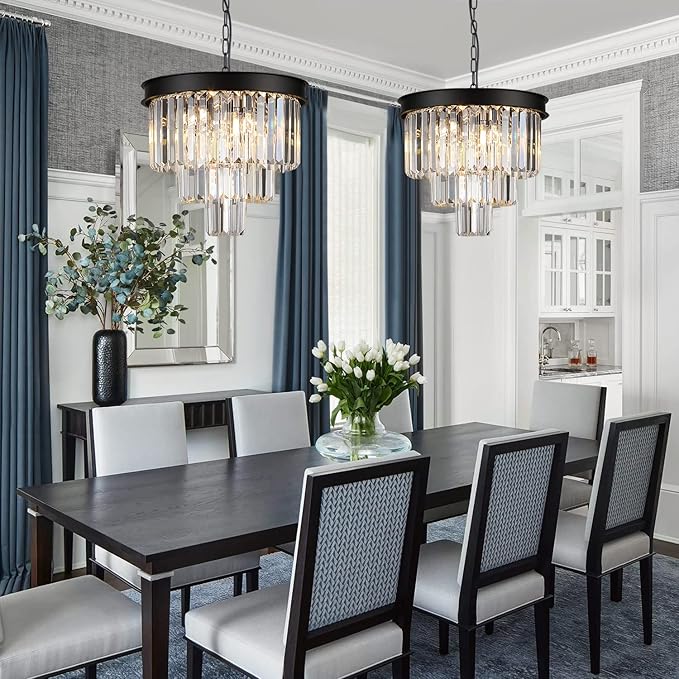 【DIMENSION】This round crystal chandelier is W 15.5” and H13” with adjustable chain, it can be adjusted to maximum 35.5”; by changing the length of the chain, it can be easily adapted to different space in your home, perfectly fits on high ceiling or lower ceiling, Please noted that this crystal chandelier is a small version in this series of black chandeliers