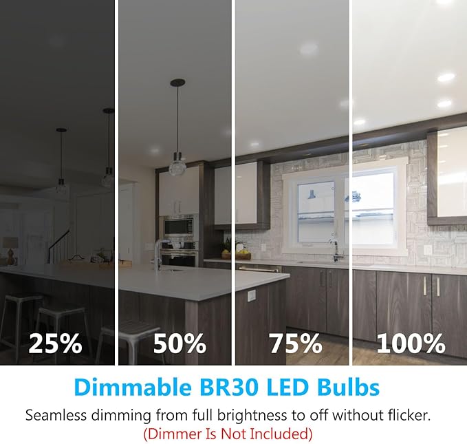 Universal Fit and Versatile Applications: Effortlessly install our 9 Watt BR30 LED indoor flood light bulbs into 5\” or 6\” recessed cans with an E26 Base,ensuring compatibility with standard fixtures.These BR30 led bulbs excel in various settings, from recessed track lighting and spotlights to ceiling lights, table lamps,floor lamps and more. Suitable for living rooms, kitchens, bedrooms,bathrooms, hallways,offices, and hotels,our LED bulbs offer unparalleled versatility.
